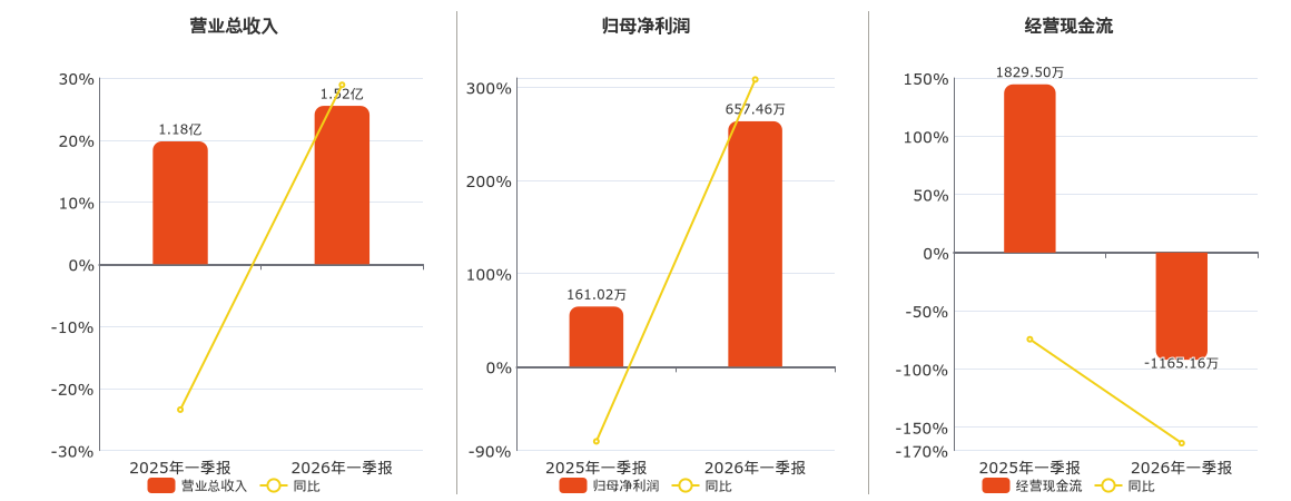 公司营业总收入为1.52亿元。归母净利润为657.46万元。经营活动现金净流入为-1165.16万元,较去年同报告期经营活动现金净流入减少2994.66万元,同比较去年同期下降163.69%。