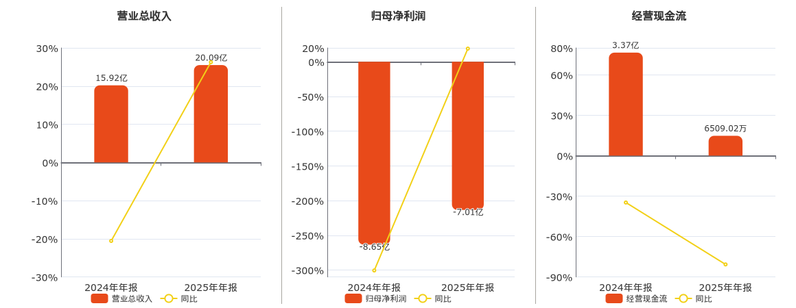 公司营业总收入为20.09亿元,在已披露的同业公司中排名第27,较去年同报告期营业总收入增加4.18亿元,同比较去年同期上涨26.26%。归母净利润为-7.01亿元,较去年同报告期归母净利润增加1.64亿元。经营活动现金净流入为6509.02万元。