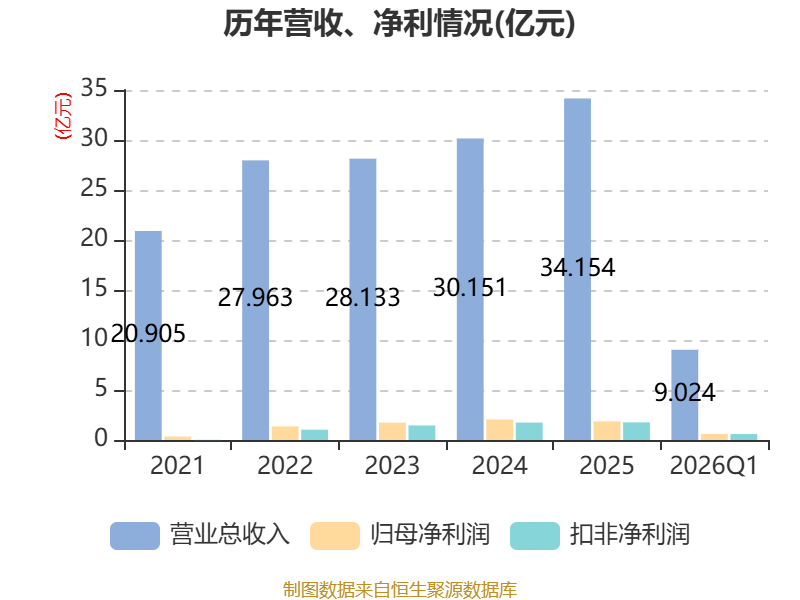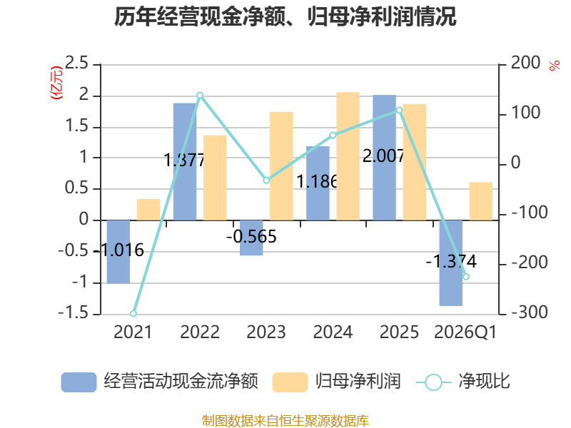 截至2026年一季度末,公司经营活动现金流净额为-1.37亿元,同比减少1.23亿元;筹资活动现金流净额1.69亿元,同比增加1.1亿元;投资活动现金流净额-1.1亿元,上年同期为-7207.04万元。