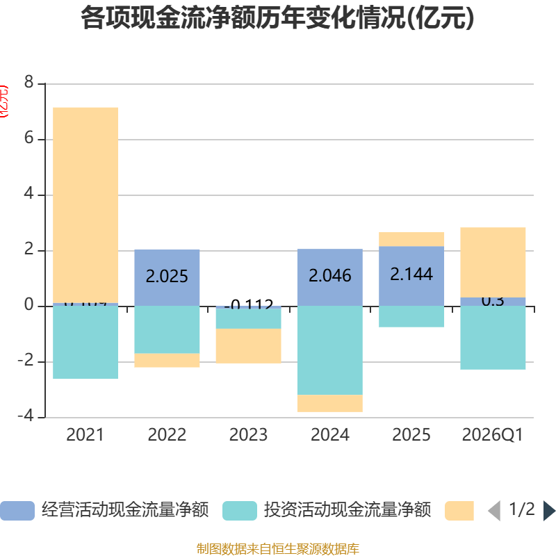 截至2026年一季度末,公司经营活动现金流净额为2996.55万元,同比增长393.82%;筹资活动现金流净额2.52亿元,同比增加2.13亿元;投资活动现金流净额-2.29亿元,上年同期为4780.71万元。