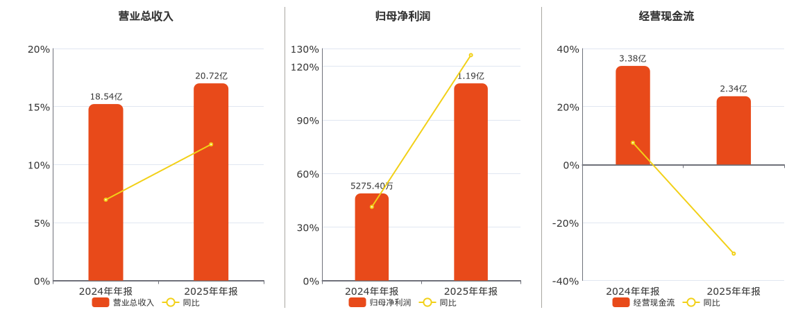 公司营业总收入为20.72亿元,在已披露的同业公司中排名第44,较去年同报告期营业总收入增加2.18亿元,实现3年连续上涨,同比较去年同期上涨11.74%。归母净利润为1.19亿元,在已披露的同业公司中排名第52,较去年同报告期归母净利润增加6663.91万元,实现2年连续上涨,同比较去年同期上涨126.32%。经营活动现金净流入为2.34亿元,在已披露的同业公司中排名第35。