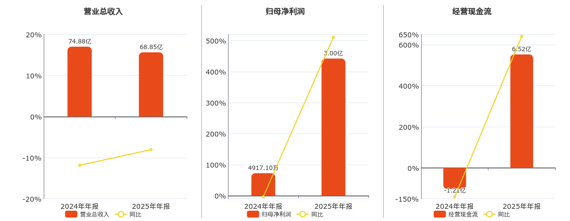 公司营业总收入为68.85亿元,较去年同报告期营业总收入减少6.03亿元,同比较去年同期下降8.05%。归母净利润为3.00亿元。经营活动现金净流入为6.52亿元。