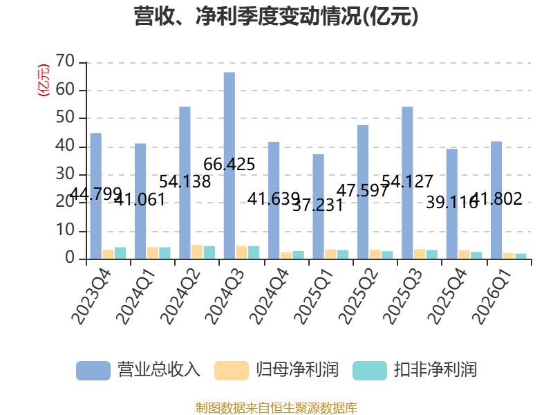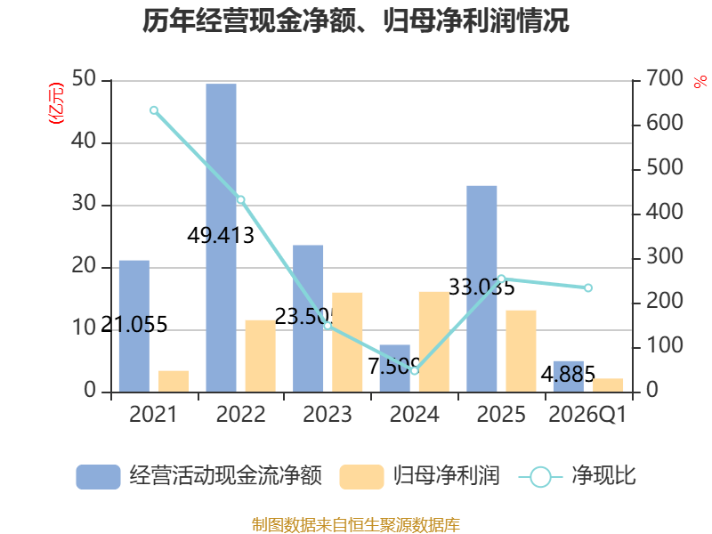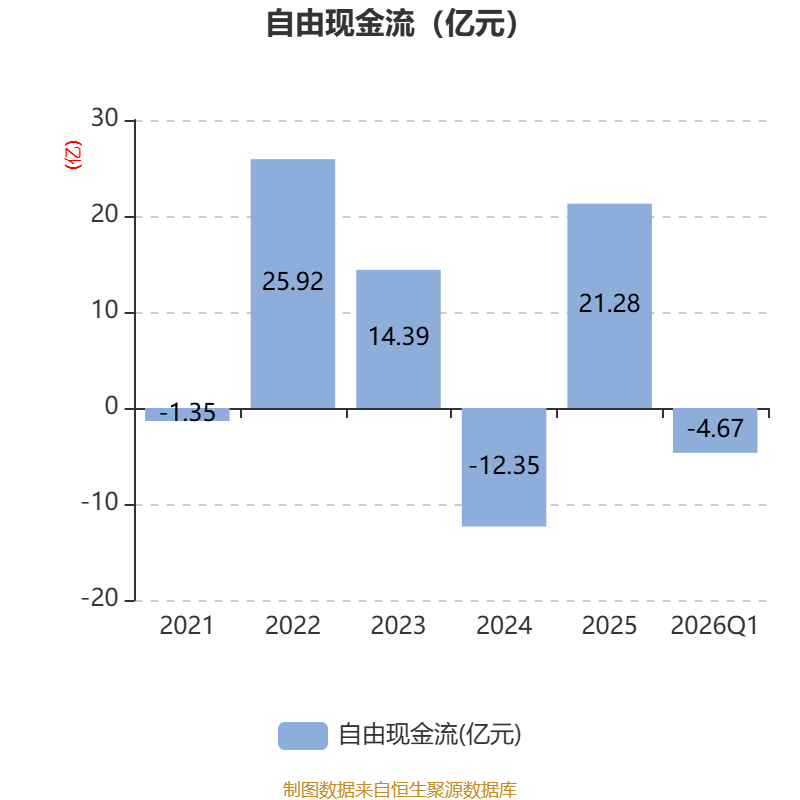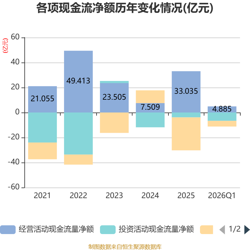 截至2026年一季度末,公司经营活动现金流净额为4.89亿元,同比下降29.79%;筹资活动现金流净额-4.55亿元,同比减少5.48亿元;投资活动现金流净额-6.68亿元,上年同期为-3.33亿元。