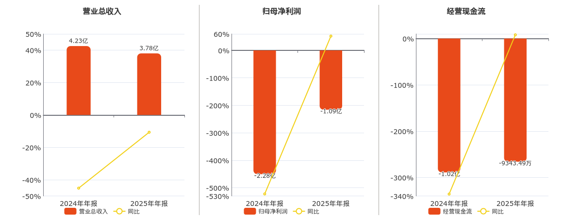 公司营业总收入为3.78亿元,在已披露的同业公司中排名第7,较去年同报告期营业总收入减少4499.96万元,同比较去年同期下降10.64%。归母净利润为-1.09亿元,在已披露的同业公司中排名第8。经营活动现金净流入为-9343.49万元,在已披露的同业公司中排名第7。