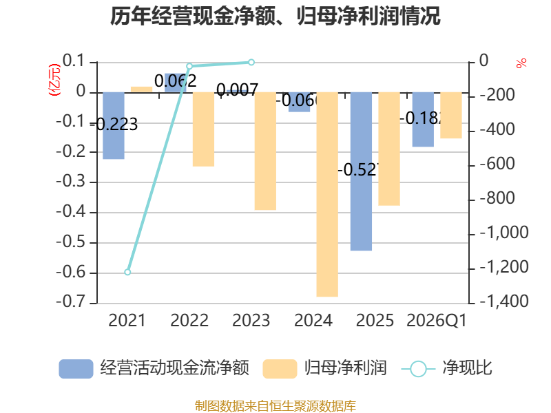 截至2026年一季度末,公司经营活动现金流净额为-1820.72万元,同比增加1756.22万元;筹资活动现金流净额768.44万元,同比增加808.09万元;投资活动现金流净额288.84万元,上年同期为2338.3万元。