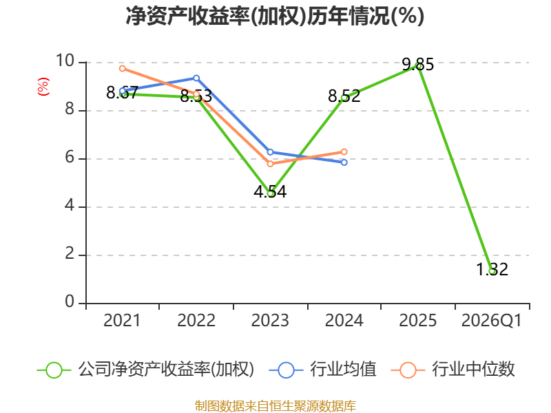 盈利能力方面, 2026年一季度公司加权平均净资产收益率为1.32%,同比下降0.18个百分点。公司2026年第一季度投入资本回报率为1.34%,较上年同期下降0.09个百分点。