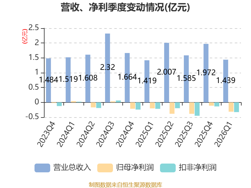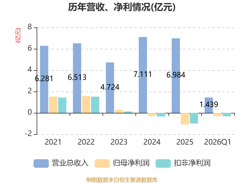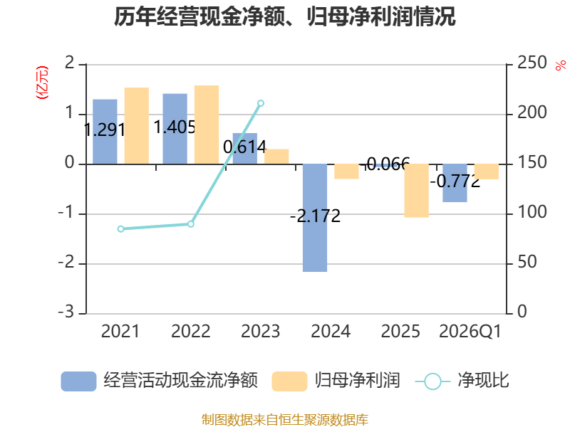 截至2026年一季度末,公司经营活动现金流净额为-7717.42万元,同比减少9198.98万元;筹资活动现金流净额2960.26万元,同比增加3070.32万元;投资活动现金流净额6634.63万元,上年同期为-5.89亿元。
