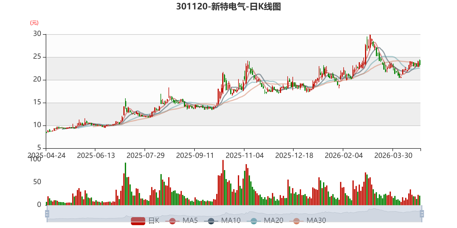 中证智能财讯新特电气(301120)4月24日披露2026年第一季度报告。公司实现营业总收入1.26亿元,同比增长43.14%;归母净利润亏损187.71万元,上年同期盈利913.82万元;扣非净利润亏损448.88万元,上年同期盈利170.07万元;经营活动产生的现金流量净额为1521.4万元,同比增长224.52%;报告期内,新特电气基本每股收益为-0.01元,加权平均净资产收益率为-0.12%。
