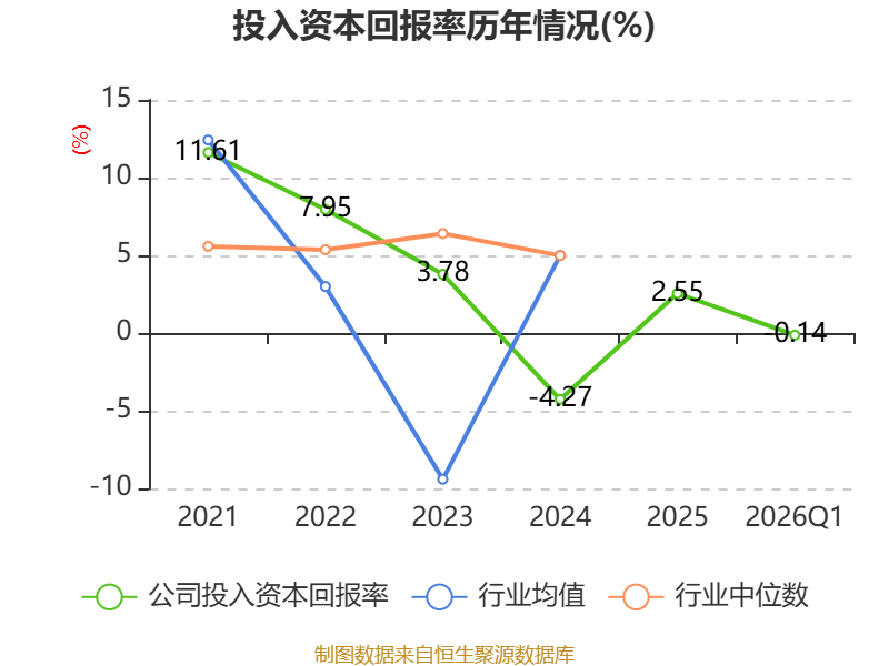 盈利能力方面, 2026年一季度公司加权平均净资产收益率为-0.12%,同比下降0.73个百分点。公司2026年第一季度投入资本回报率为-0.14%,较上年同期下降0.64个百分点。