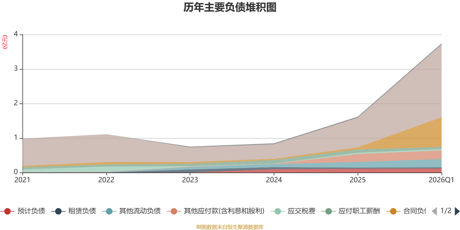 负债重大变化方面,截至2026年一季度末,公司应付票据及应付账款较上年末增加146.28%,占公司总资产比重上升5.91个百分点;合同负债较上年末增加1286.06%,占公司总资产比重上升4.07个百分点;其他流动负债较上年末增加47.84%,占公司总资产比重上升0.3个百分点;应付职工薪酬较上年末减少34.47%,占公司总资产比重下降0.23个百分点。