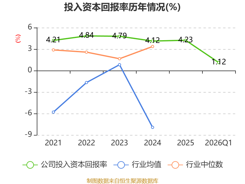 盈利能力方面, 2026年一季度公司加权平均净资产收益率为2.5%,同比上升0.14个百分点。公司2026年第一季度投入资本回报率为1.12%,较上年同期上升0.66个百分点。
