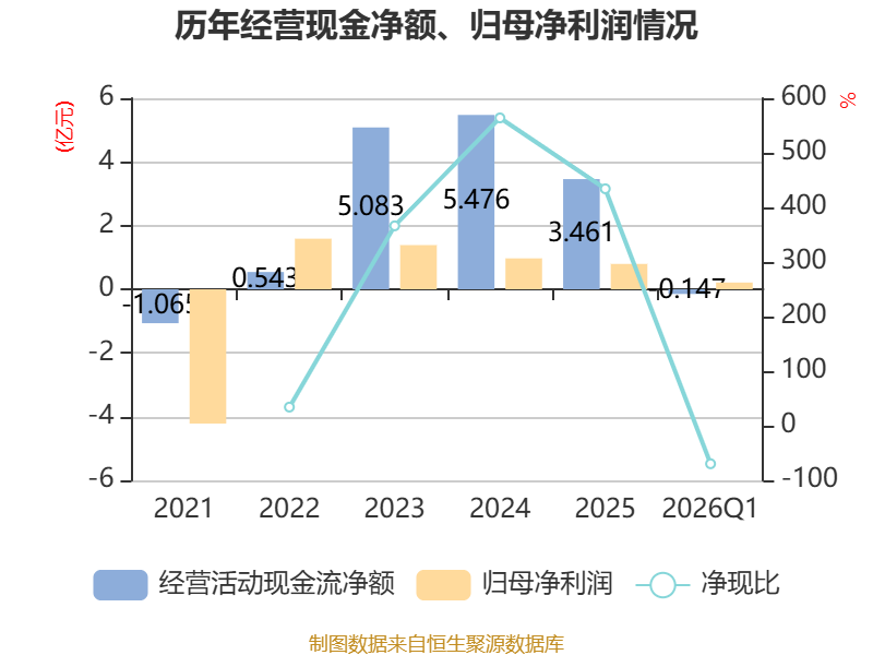 截至2026年一季度末,公司经营活动现金流净额为-1473.44万元,同比增加6878.22万元;筹资活动现金流净额3025.34万元,同比减少1.96亿元;投资活动现金流净额-1097.16万元,上年同期为-2280.01万元。