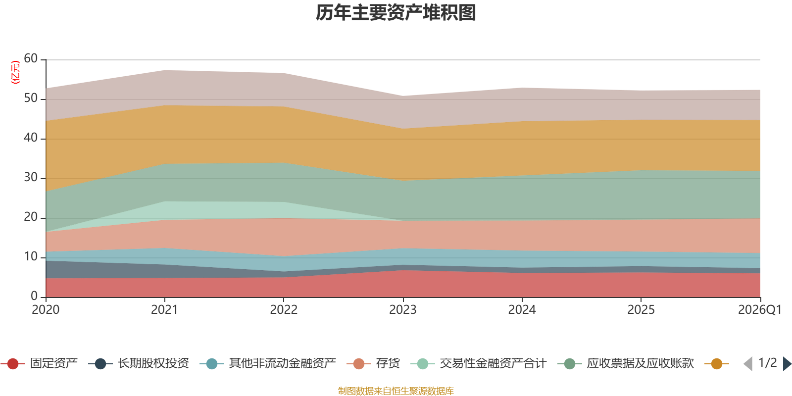 资产重大变化方面,截至2026年一季度末,公司存货较上年末增加8.8%,占公司总资产比重上升1.31个百分点;应收票据及应收账款较上年末减少4.02%,占公司总资产比重下降1.02个百分点;长期股权投资较上年末减少17.97%,占公司总资产比重下降0.55个百分点;固定资产较上年末减少3.38%,占公司总资产比重下降0.43个百分点。