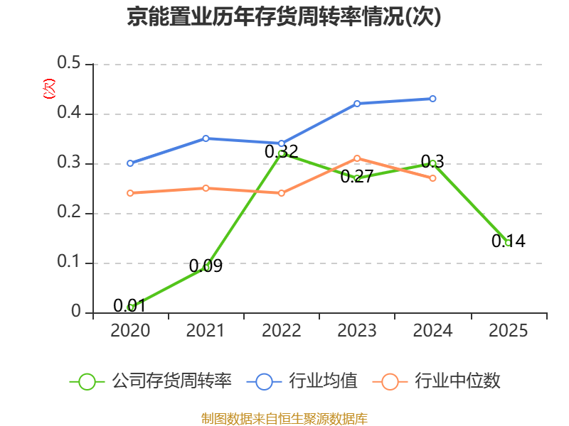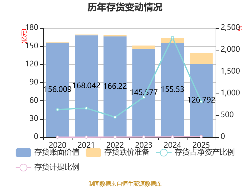 从存货变动来看,截至2025年末,公司存货账面价值为120.79亿元,占净资产的815.93%,较上年末减少34.74亿元。其中,存货跌价准备为18亿元,计提比例为12.97%。