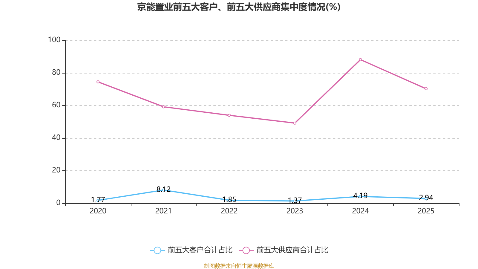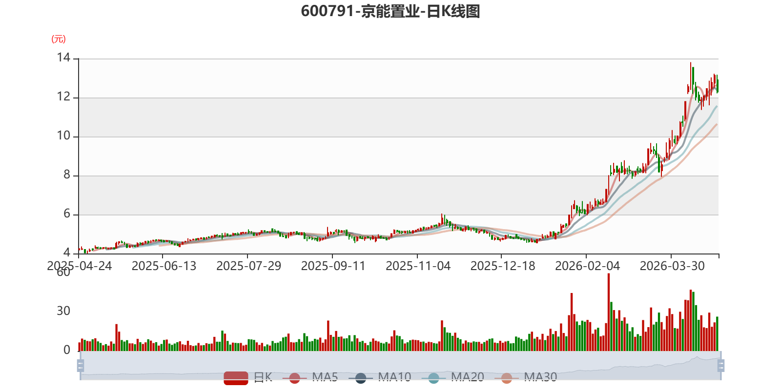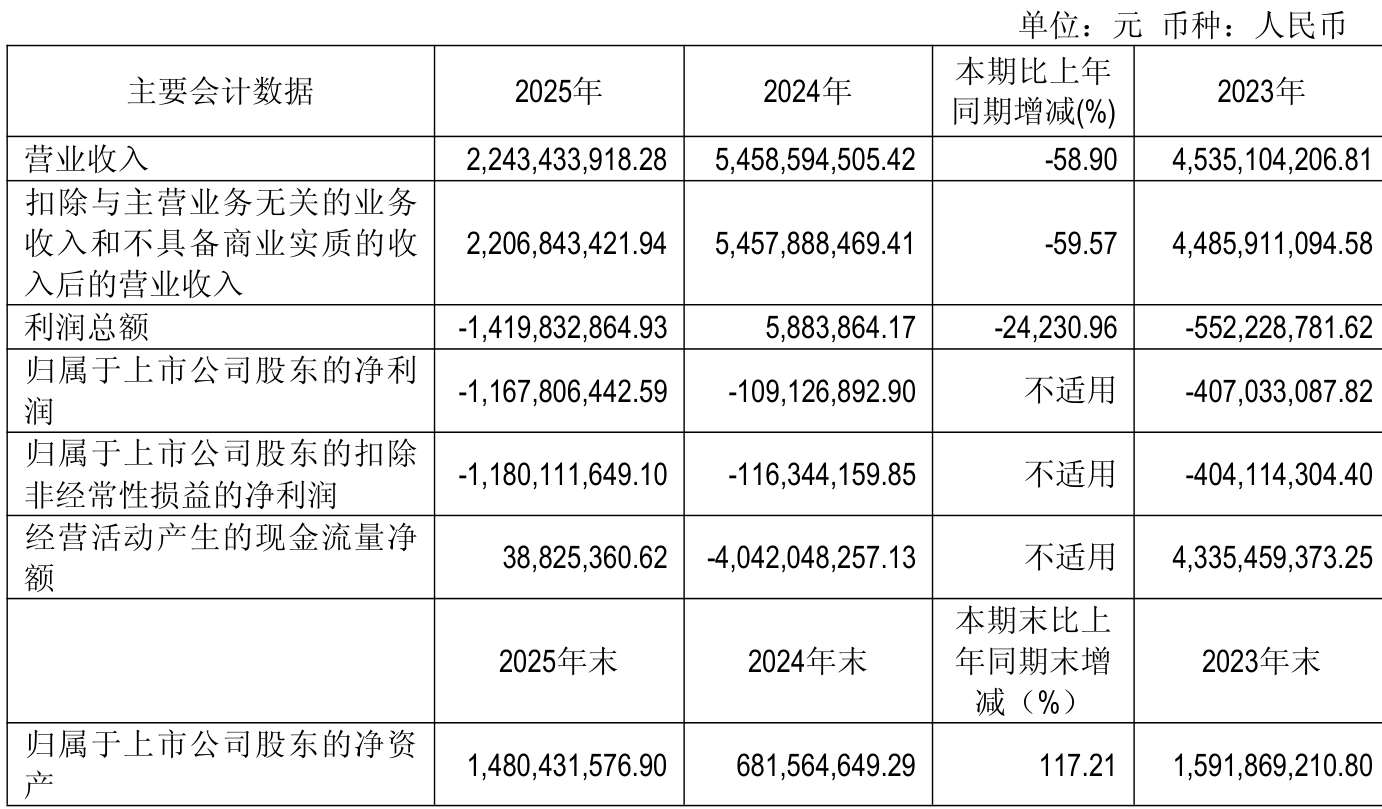 中证智能财讯京能置业(600791)4月24日披露2025年年度报告。2025年,公司实现营业总收入22.43亿元,同比下降58.90%;归母净利润亏损11.68亿元,上年同期亏损1.09亿元;扣非净利润亏损11.8亿元,上年同期亏损1.16亿元;经营活动产生的现金流量净额为3882.54万元,上年同期为-40.42亿元;报告期内,京能置业基本每股收益为-2.5786元,加权平均净资产收益率为-73.51%。