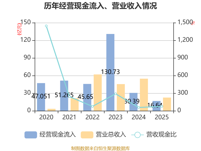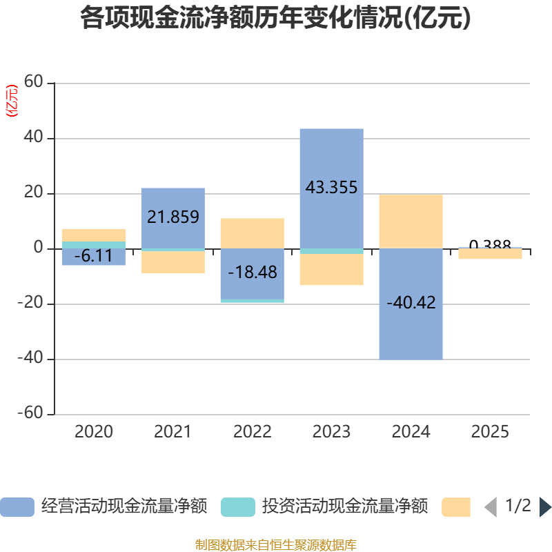 截至2025年,公司经营活动现金流净额为3882.54万元,同比增加40.81亿元;筹资活动现金流净额-3.8亿元,同比减少23.12亿元;投资活动现金流净额143.58万元,上年同期为1164.11万元。