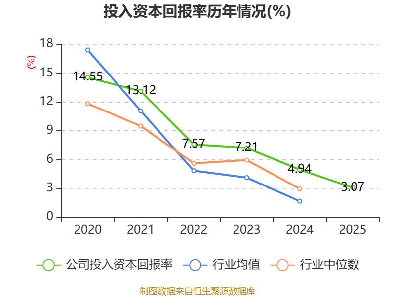 数据显示,2025年公司加权平均净资产收益率为3.85%,较上年同期下降1.94个百分点。公司2025年投入资本回报率为3.07%,较上年同期下降1.87个百分点。