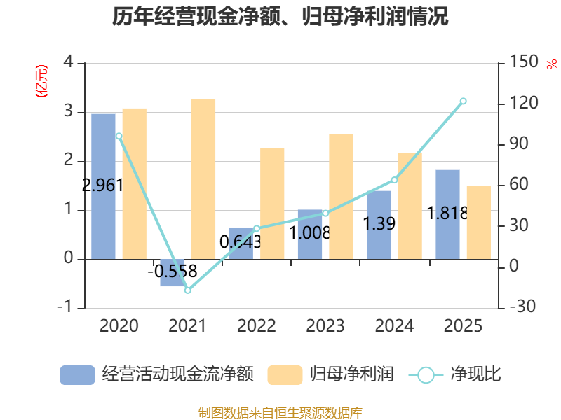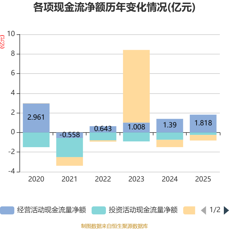 截至2025年,公司经营活动现金流净额为1.82亿元,同比增长30.77%;筹资活动现金流净额-5687.09万元,同比增加1806.7万元;投资活动现金流净额-2476.93万元,上年同期为-7423.33万元。