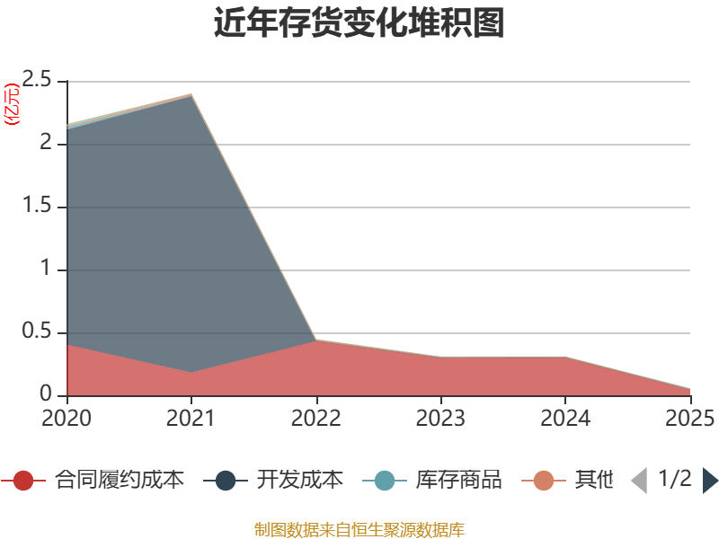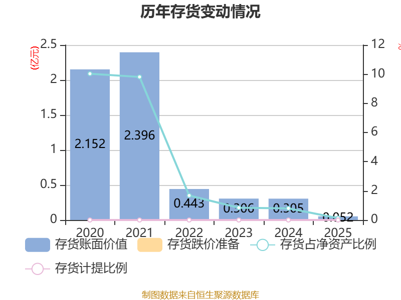 从存货变动来看,截至2025年末,公司存货账面价值为516.07万元,占净资产的0.13%,较上年末减少2534.59万元。公司本期没有计提存货跌价准备。