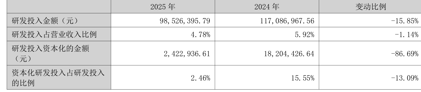 2025年全年,公司研发投入金额为9852.64万元,同比下降15.85%;研发投入占营业收入比例为4.78%,相比上年同期下降1.14个百分点。此外,公司全年研发投入资本化率为2.46%。