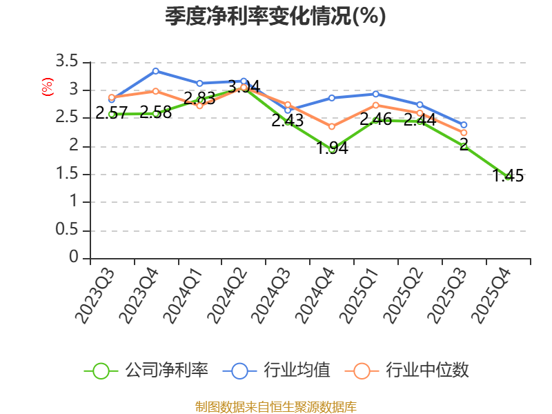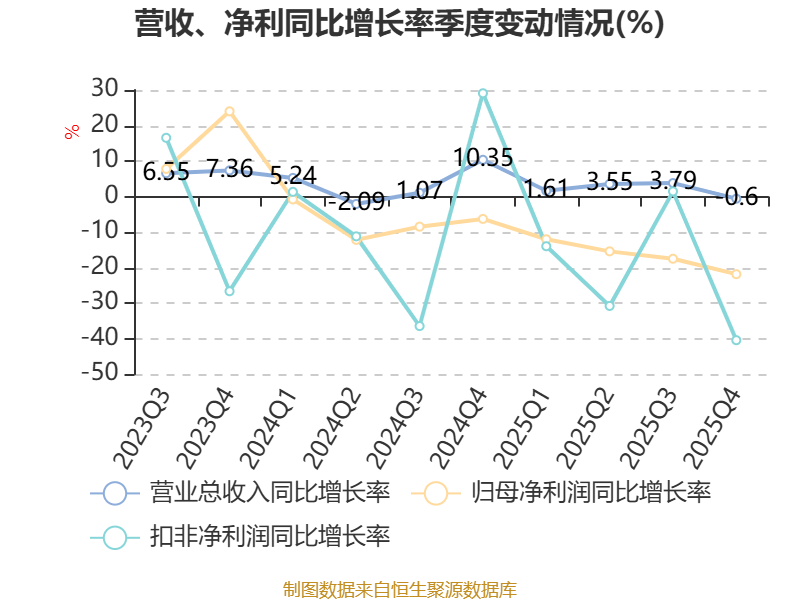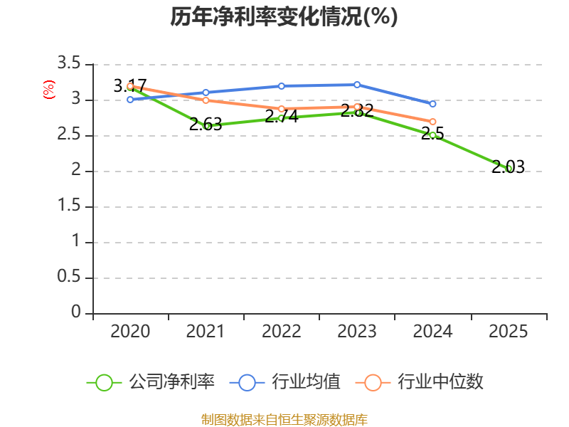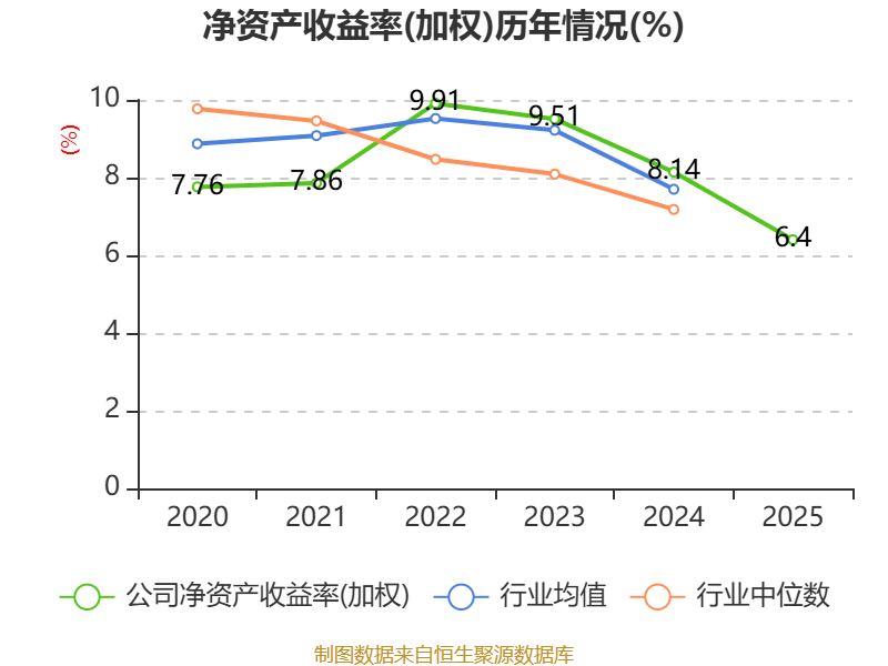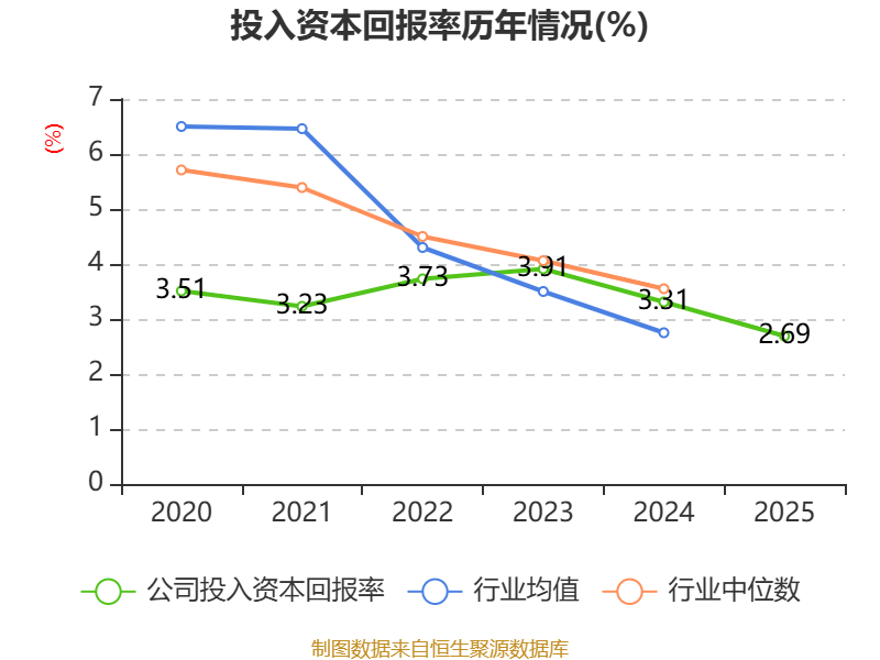 数据显示,2025年公司加权平均净资产收益率为6.4%,较上年同期下降1.74个百分点。公司2025年投入资本回报率为2.69%,较上年同期下降0.62个百分点。