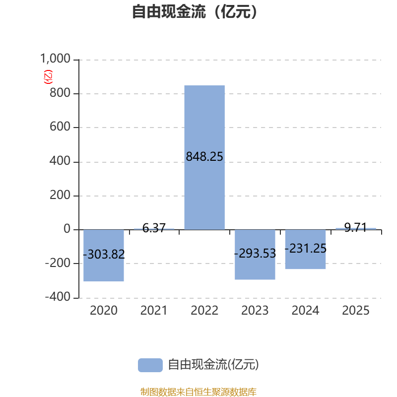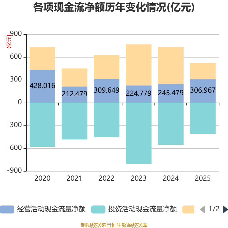 截至2025年,公司经营活动现金流净额为306.97亿元,同比增长25.05%;筹资活动现金流净额212.69亿元,同比减少274.34亿元;投资活动现金流净额-411.13亿元,上年同期为-555.8亿元。