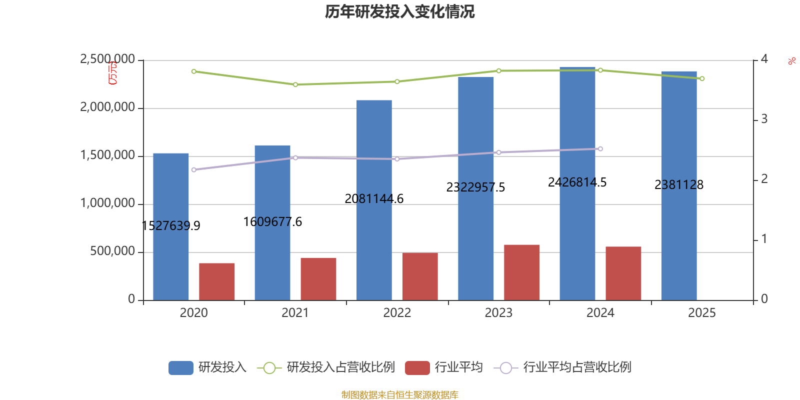 2025年全年,公司研发投入金额为238.11亿元,同比下降1.88%;研发投入占营业收入比例为3.69%,相比上年同期下降0.14个百分点。此外,公司全年研发投入资本化率为0.05%。