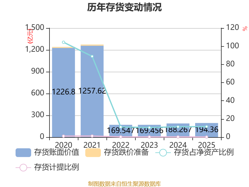 从存货变动来看,截至2025年末,公司存货账面价值为194.36亿元,占净资产的11.6%,较上年末增加6.09亿元。其中,存货跌价准备为2573.76万元,计提比例为0.13%。