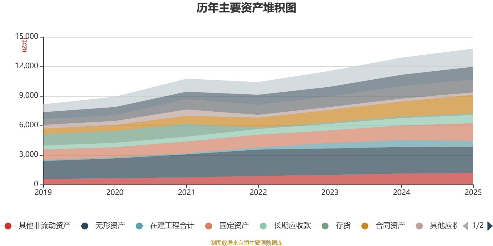 资产重大变化方面,截至2025年末,公司无形资产较上年末减少2.41%,占公司总资产比重下降1.85个百分点;合同资产较上年末增加22.37%,占公司总资产比重上升1.67个百分点;固定资产较上年末增加22.21%,占公司总资产比重上升1.6个百分点;在建工程合计较上年末减少12%,占公司总资产比重下降1.02个百分点。