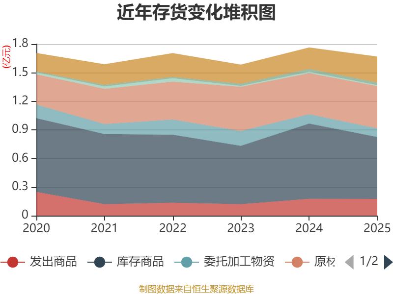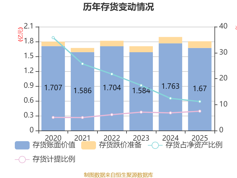 从存货变动来看,截至2025年末,公司存货账面价值为1.67亿元,占净资产的11.18%,较上年末减少927.52万元。其中,存货跌价准备为1346.95万元,计提比例为7.46%。