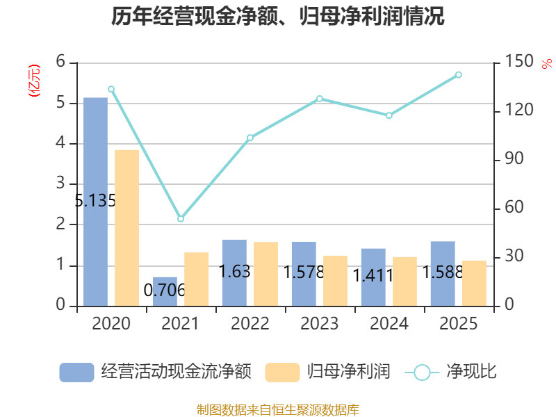 截至2025年,公司经营活动现金流净额为1.59亿元,同比增长12.54%;筹资活动现金流净额-4749.45万元,同比减少4.35亿元;投资活动现金流净额-6643.16万元,上年同期为-3650.56万元。