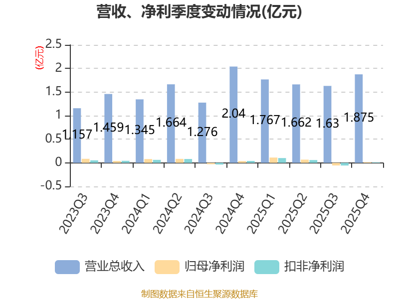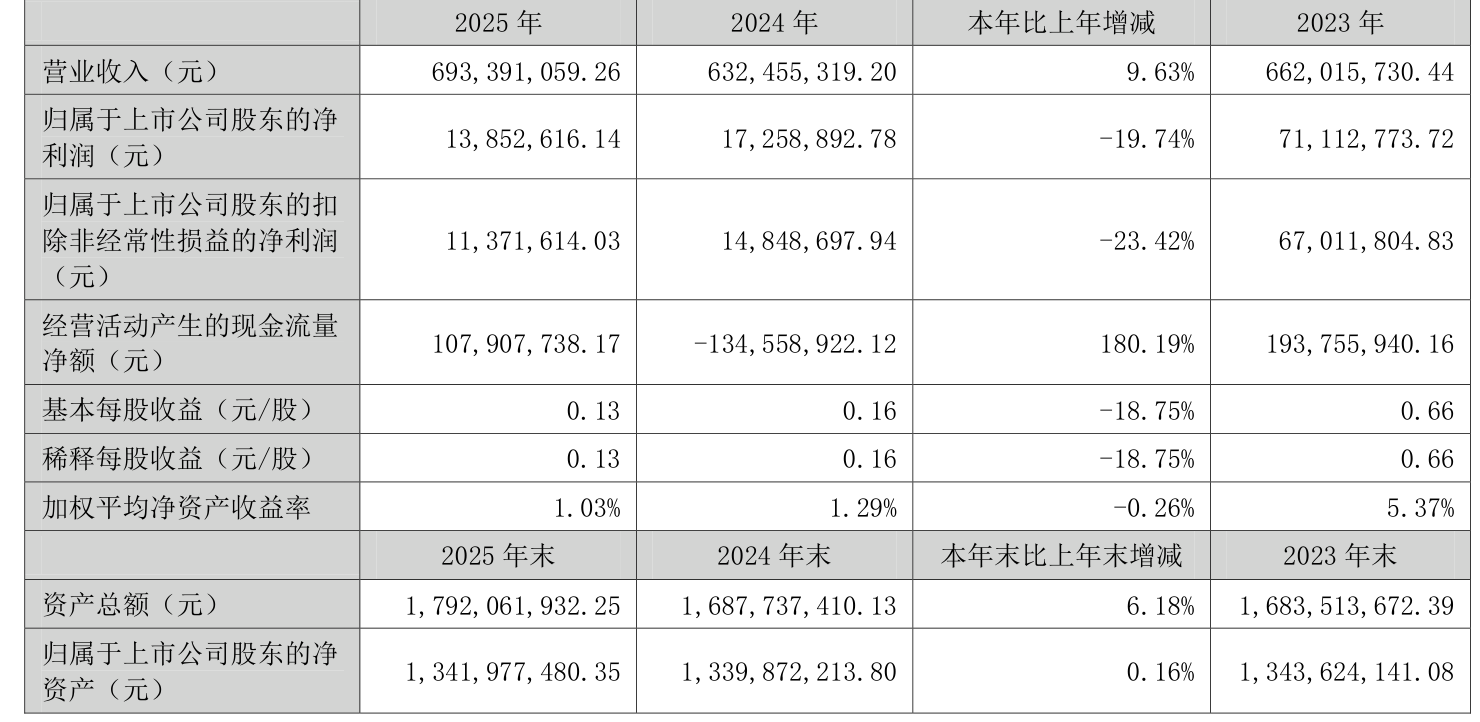 中证智能财讯联盛化学(301212)4月24日披露2025年年度报告。2025年,公司实现营业总收入6.93亿元,同比增长9.63%;归母净利润1385.26万元,同比下降19.74%;扣非净利润1137.16万元,同比下降23.42%;经营活动产生的现金流量净额为1.08亿元,上年同期为-1.35亿元;报告期内,联盛化学基本每股收益为0.13元,加权平均净资产收益率为1.03%。公司2025年度分配预案为:拟向全体股东每10股派现1.02元(含税)。