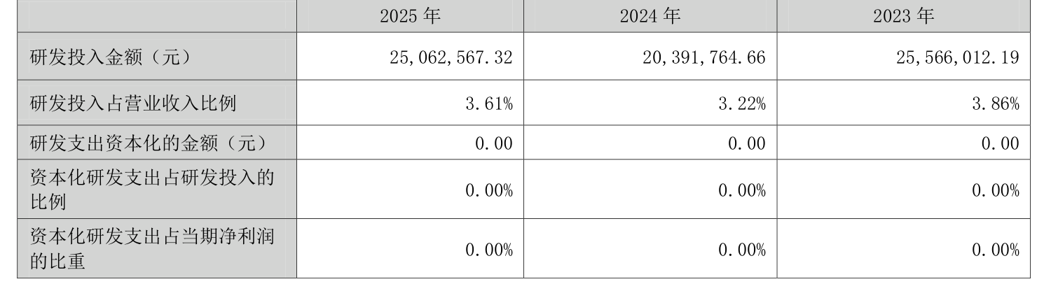 2025年全年,公司研发投入金额为2506.26万元,同比增长22.91%;研发投入占营业收入比例为3.61%,相比上年同期上升0.39个百分点。此外,公司全年研发投入资本化率为0%。