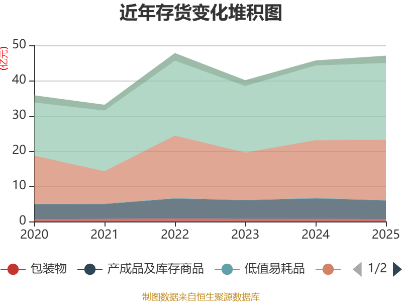 从存货变动来看,截至2025年末,公司存货账面价值为47.05亿元,占净资产的61.41%,较上年末增加1.36亿元。其中,存货跌价准备为2.98亿元,计提比例为5.95%。