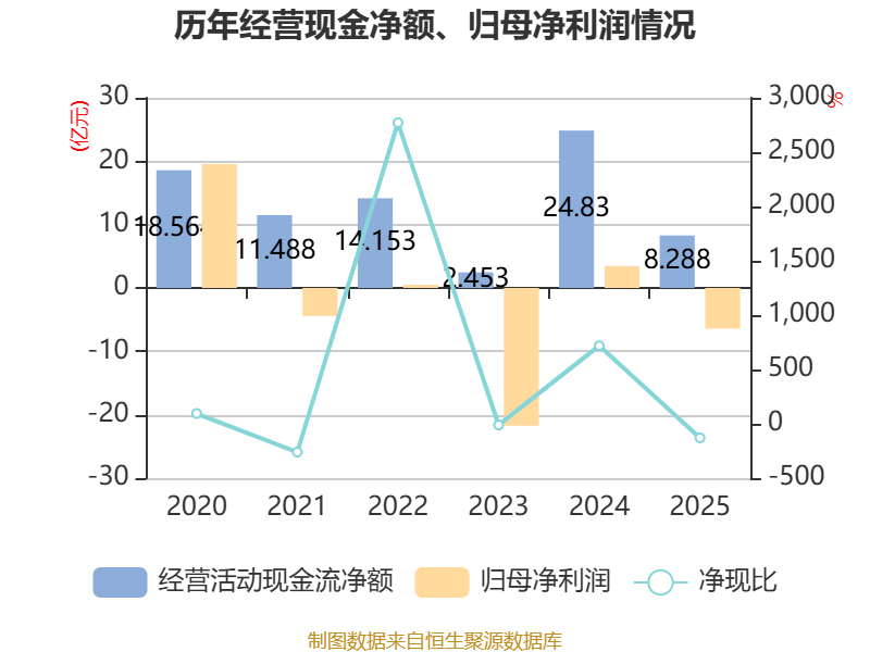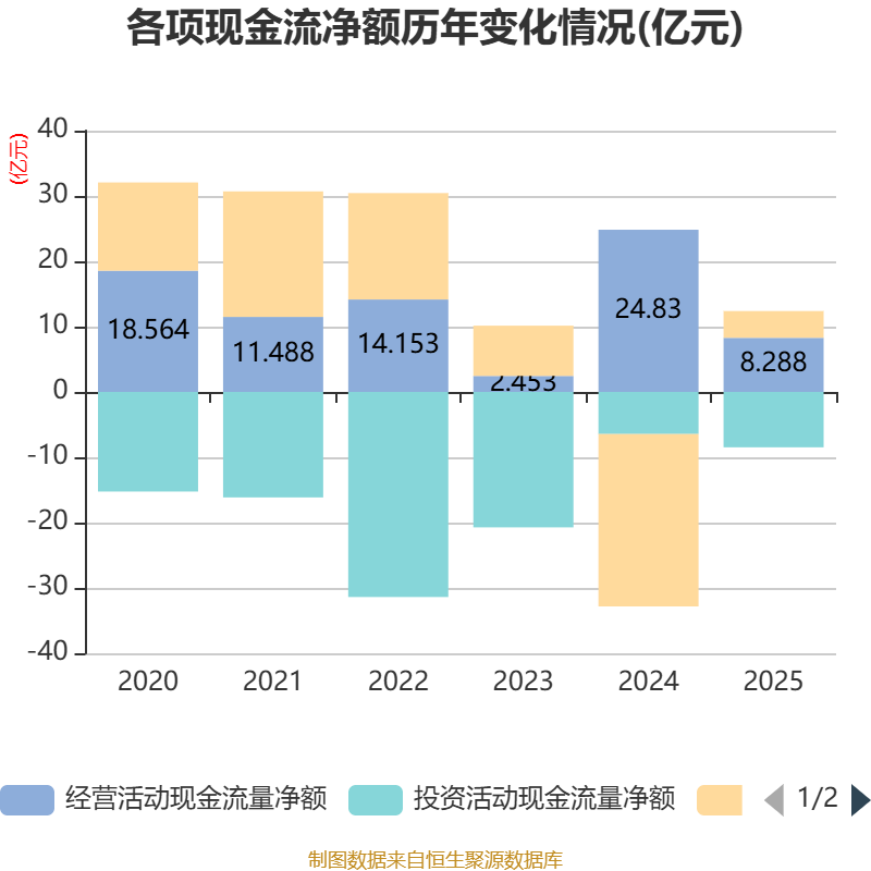 截至2025年,公司经营活动现金流净额为8.29亿元,同比下降66.62%;筹资活动现金流净额4.09亿元,同比增加30.48亿元;投资活动现金流净额-8.48亿元,上年同期为-6.45亿元。