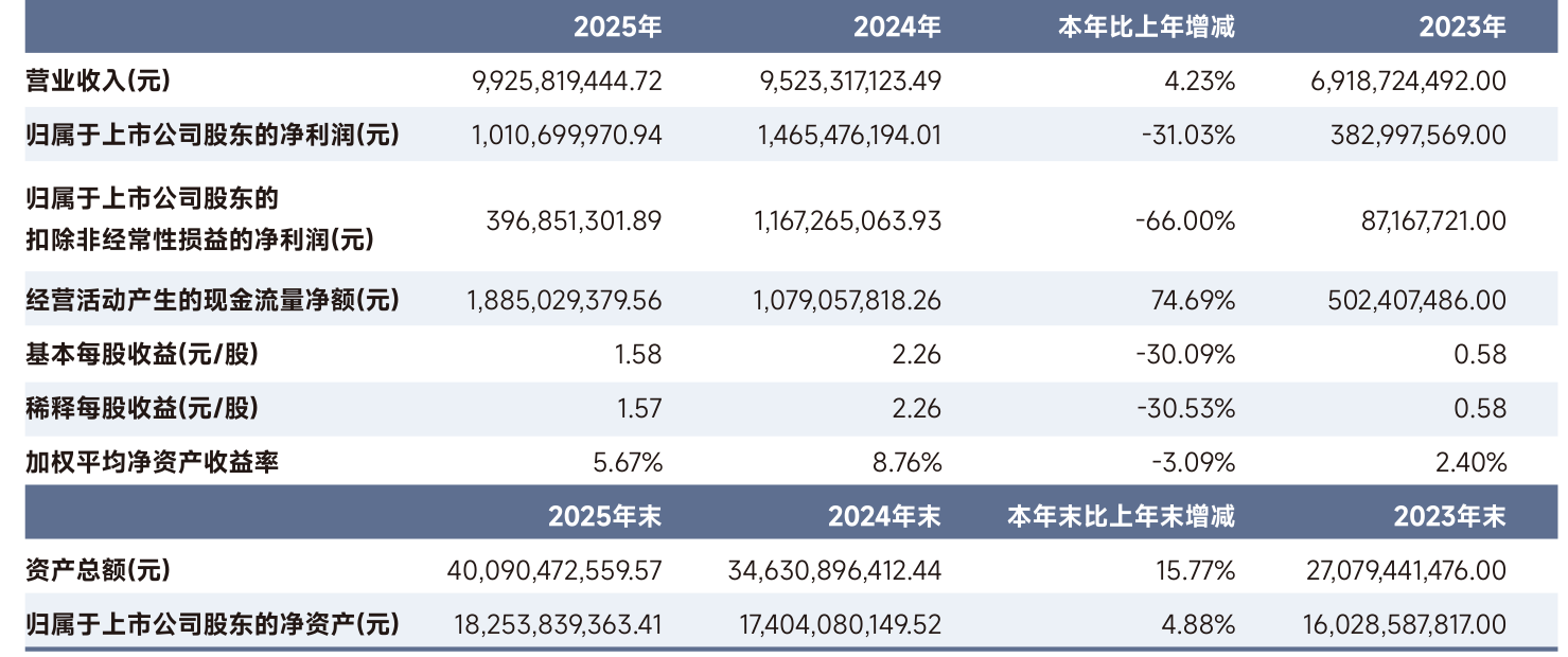 中证智能财讯英科医疗(300677)4月24日披露2025年年度报告。2025年,公司实现营业总收入99.26亿元,同比增长4.23%;归母净利润10.11亿元,同比下降31.03%;扣非净利润3.97亿元,同比下降66.00%;经营活动产生的现金流量净额为18.85亿元,同比增长74.69%;报告期内,英科医疗基本每股收益为1.58元,加权平均净资产收益率为5.67%。公司2025年度分配预案为:拟向全体股东每10股派现1元(含税)。