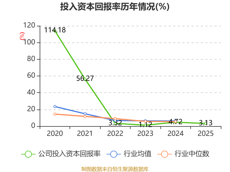 数据显示,2025年公司加权平均净资产收益率为5.67%,较上年同期下降3.09个百分点。公司2025年投入资本回报率为3.13%,较上年同期下降1.59个百分点。
