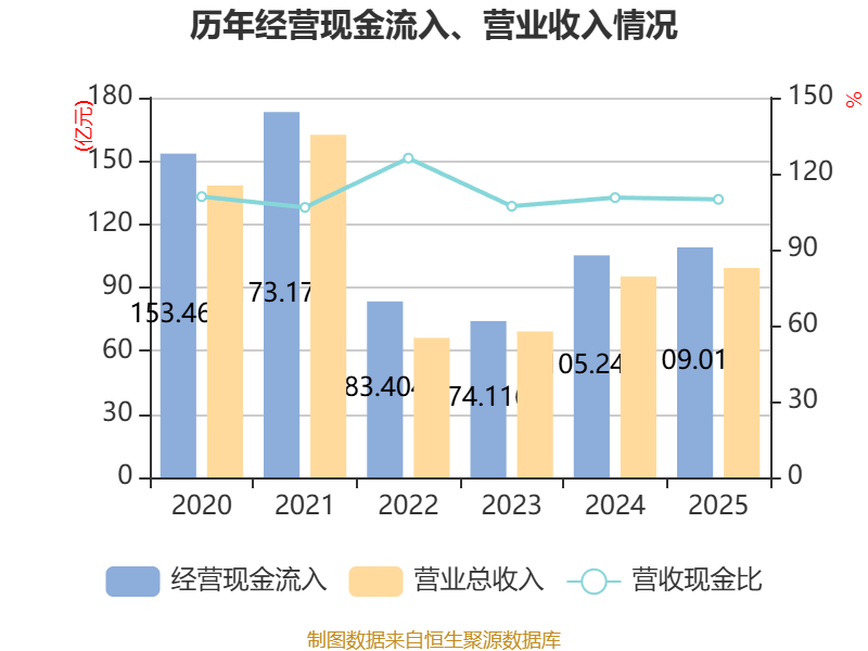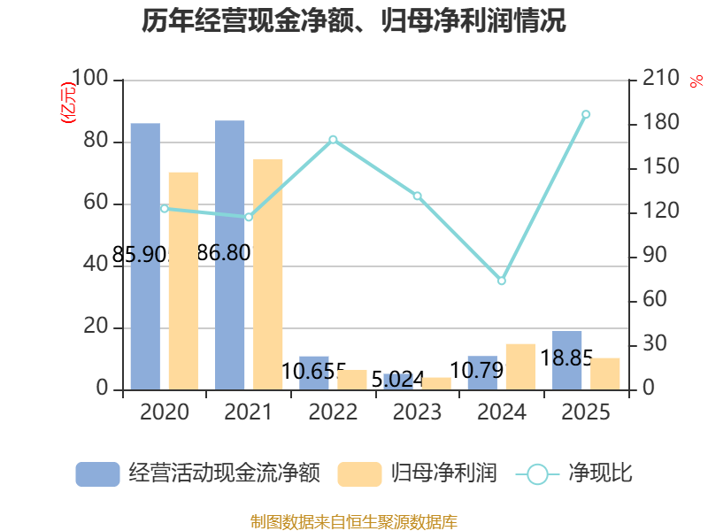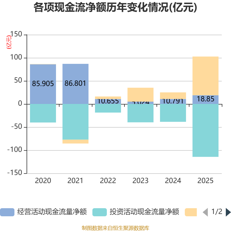 截至2025年,公司经营活动现金流净额为18.85亿元,同比增长74.69%;筹资活动现金流净额83.78亿元,同比增加69.53亿元;投资活动现金流净额-114.52亿元,上年同期为-38.68亿元。