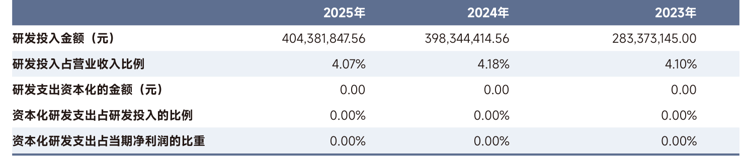 2025年全年,公司研发投入金额为4.04亿元,同比增长1.52%;研发投入占营业收入比例为4.07%,相比上年同期下降0.11个百分点。此外,公司全年研发投入资本化率为0%。