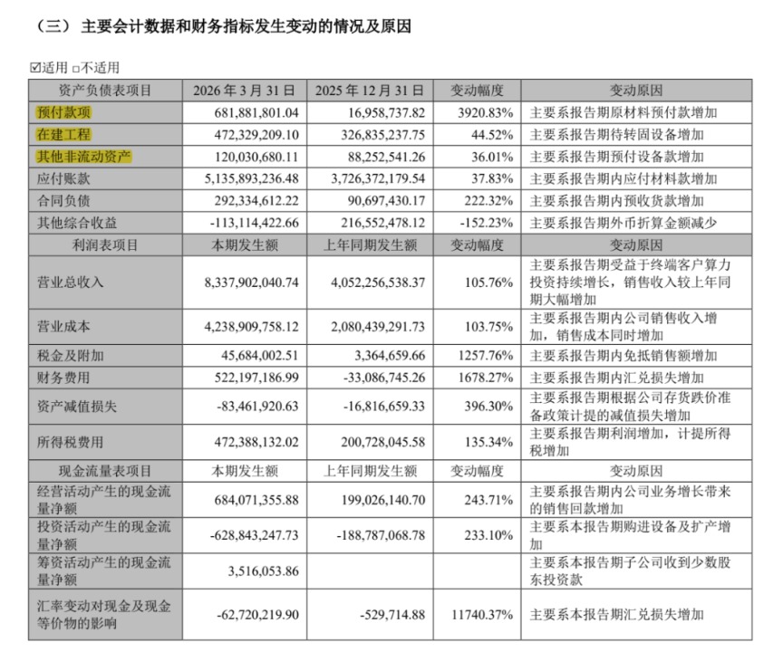 新易盛一季度财务数据也显示,公司正在备料扩产。截至第一季度末,公司预付原材料款增加带动预付款项大幅增长至6.82亿元;公司存货规模增长至90.26亿元;在建工程增长至4.72亿元;其他非流动资产(主要为预付设备款)增长至1.20亿元,表明扩产节奏加快。