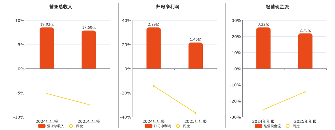 公司营业总收入为17.60亿元,在已披露的同业公司中排名第98,较去年同报告期营业总收入减少1.42亿元,同比较去年同期下降7.45%。归母净利润为1.45亿元,较去年同报告期归母净利润减少8393.10万元,同比较去年同期下降36.73%。经营活动现金净流入为2.75亿元,较去年同报告期经营活动现金净流入减少4614.35万元,同比较去年同期下降14.35%。