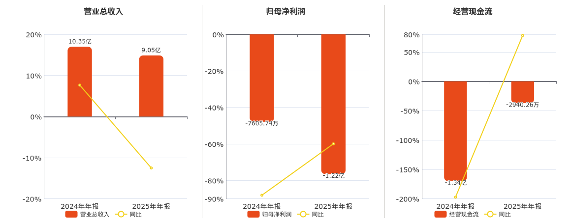 公司营业总收入为9.05亿元,在已披露的同业公司中排名第128,较去年同报告期营业总收入减少1.30亿元,同比较去年同期下降12.52%。归母净利润为-1.22亿元,在已披露的同业公司中排名第171,较去年同报告期归母净利润减少4557.04万元。经营活动现金净流入为-2940.26万元,在已披露的同业公司中排名第165。