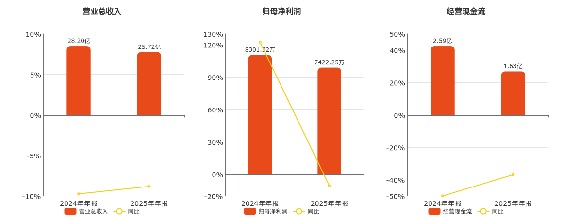 公司营业总收入为25.72亿元,较去年同报告期营业总收入减少2.49亿元,同比较去年同期下降8.81%。归母净利润为7422.25万元,较去年同报告期归母净利润减少879.06万元,同比较去年同期下降10.59%。经营活动现金净流入为1.63亿元,较去年同报告期经营活动现金净流入减少9517.99万元,同比较去年同期下降36.81%。