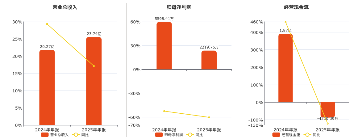 公司营业总收入为23.74亿元。归母净利润为2219.75万元,在已披露的同业公司中排名第41,较去年同报告期归母净利润减少3378.66万元,同比较去年同期下降60.35%。经营活动现金净流入为-4200.39万元,在已披露的同业公司中排名第56,较去年同报告期经营活动现金净流入减少2.29亿元,同比较去年同期下降122.43%。