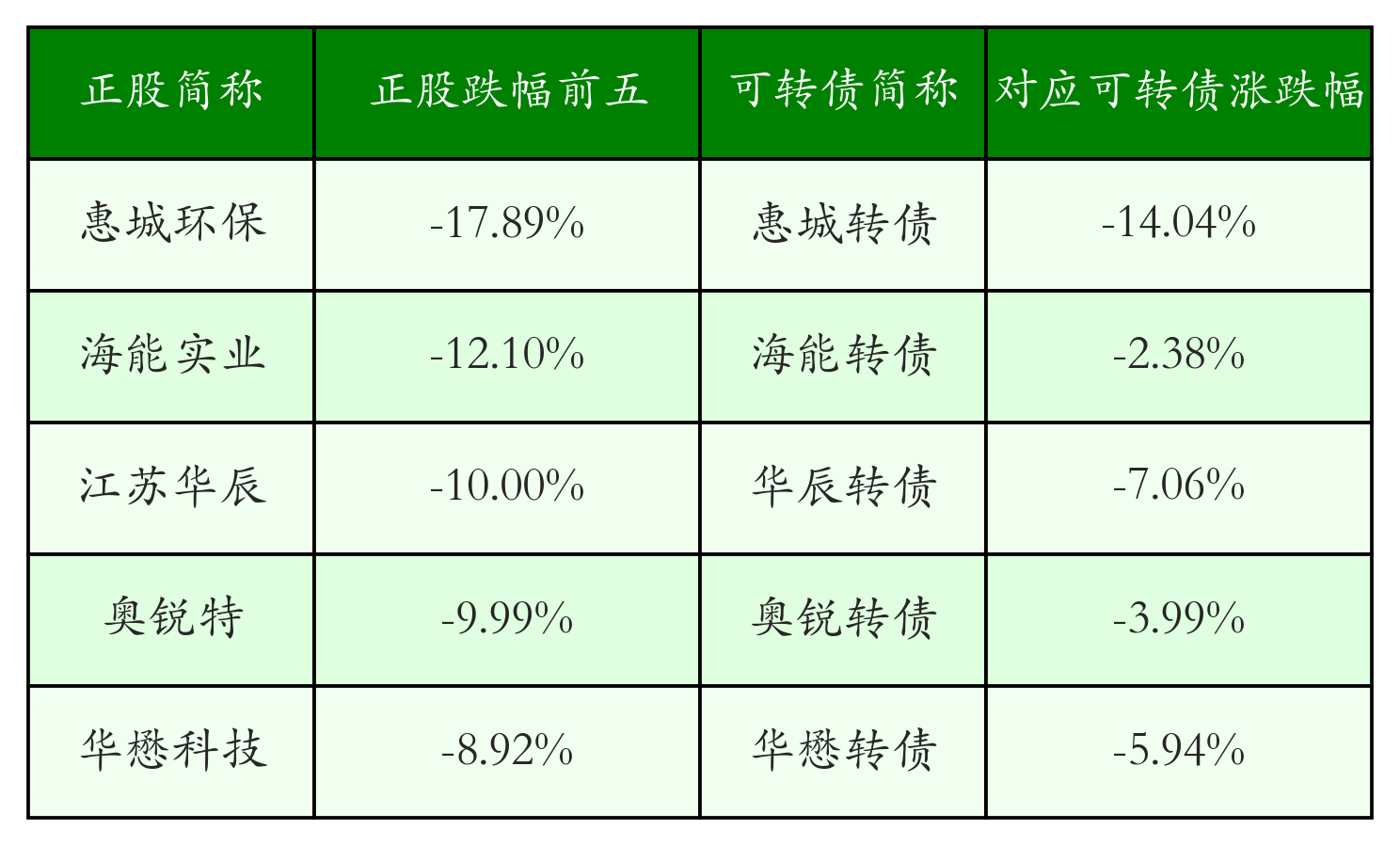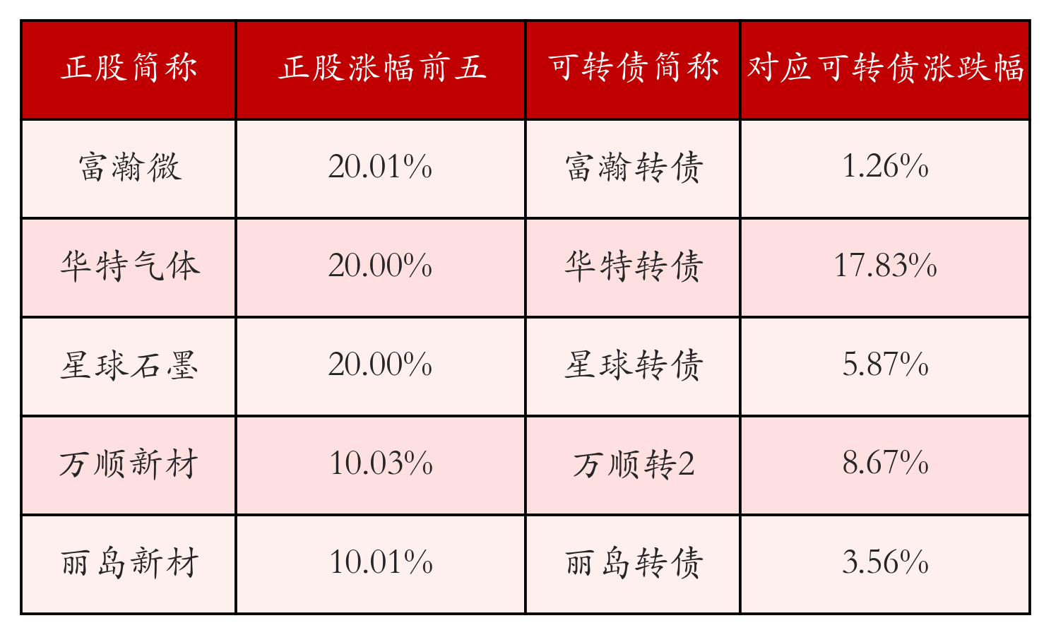 南财智讯4月24日电,盘后数据显示,债市方面,中证转债指数收跌0.35%,报514.03,成交额为797.25亿元。可转债方面,今日共成交335只可转债,其中108只收涨,1只收平,226只收跌。具体来看,18只可转债涨幅超过2%。其中汇车退债(404004)涨60.33%,华特转债(118033)涨17.83%,泰坦转债(127096)涨9.08%。今日有39只可转债跌幅超2%,惠城转债(123118)跌14.04%,利柏转债(111023)跌13.12%,盈峰转债(127024)跌8.3%。存在交易量的可转债所对应的正股中,120只收涨,9只收平,206只收跌。具体来看,19只可转债对应正股涨幅超过5%,其中,富瀚微(300613)涨停,收涨20.01%;华特气体(688268)涨停,收涨20.0%;星球石墨(688633)涨停,收涨20.0%。同时所对应的可转债:富瀚转债(123122)同涨1.26%;华特转债(118033)同涨17.83%;星球转债(118041)同涨5.87%。今日有16只可转债对应正股跌幅超过5%,江苏华辰(603097)跌停,收跌10.0%。同时所对应的可转债:华辰转债(113695)同跌7.06%;奥锐转债(111021)同跌3.99%。