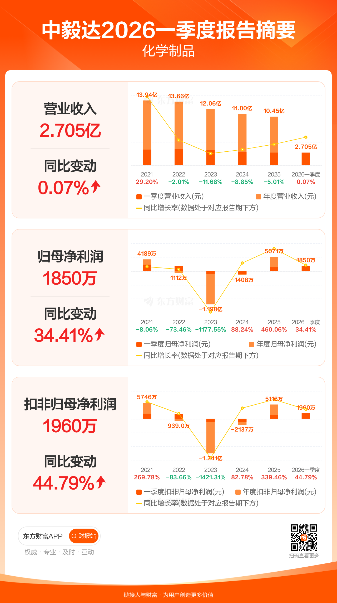 中毅达4月25日发布2026年一季报显示,公司一季度实现营业收入2.71亿元,同比增长0.07%;归母净利润1849.66万元,同比增长34.41%;扣非归母净利润1959.56万元,同比增长44.79%。