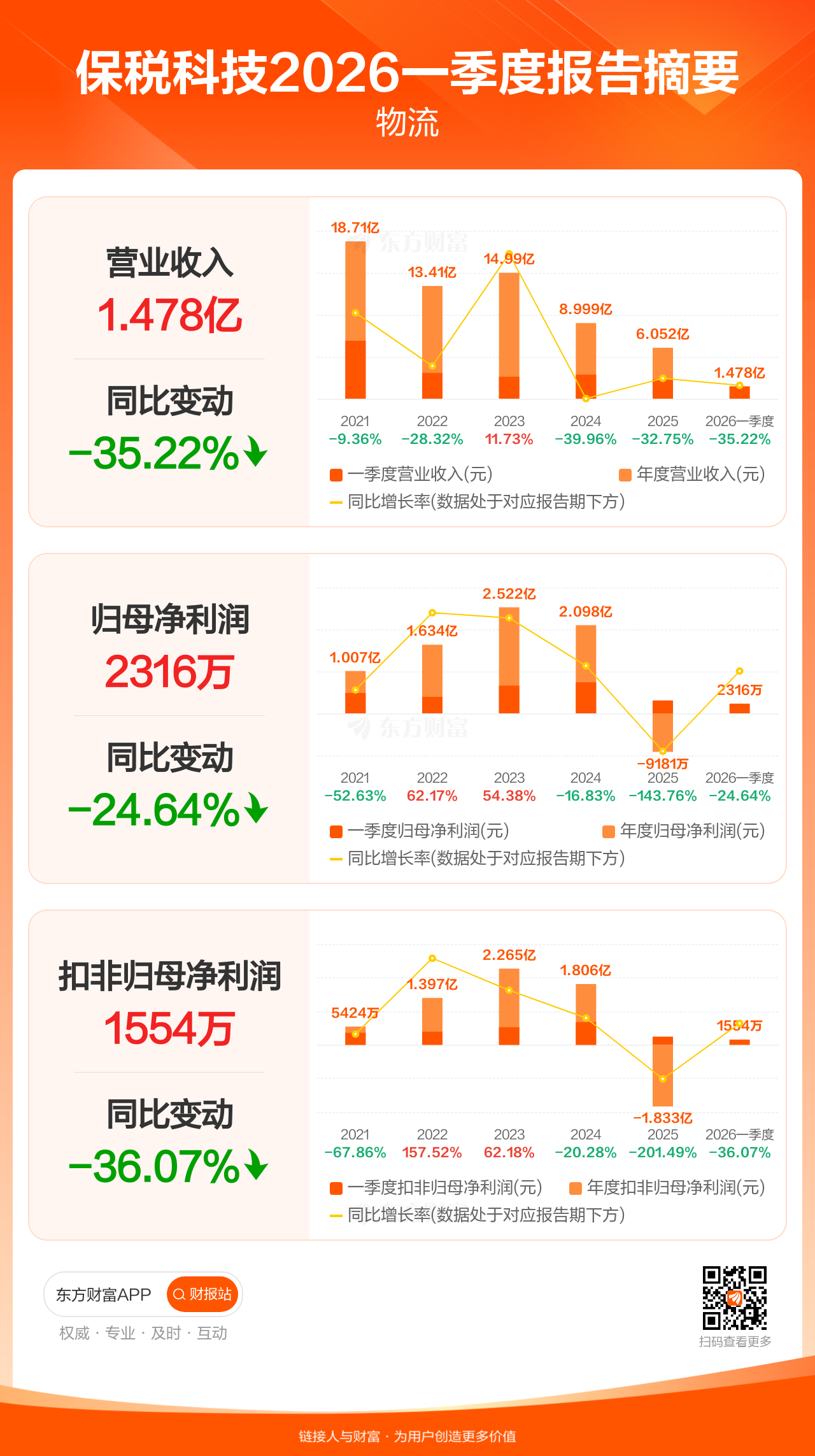 保税科技4月25日发布2026年一季报显示,公司一季度实现营业收入1.48亿元,同比下滑35.22%;归母净利润2316.08万元,同比下滑24.64%;扣非归母净利润1553.66万元,同比下滑36.07%。