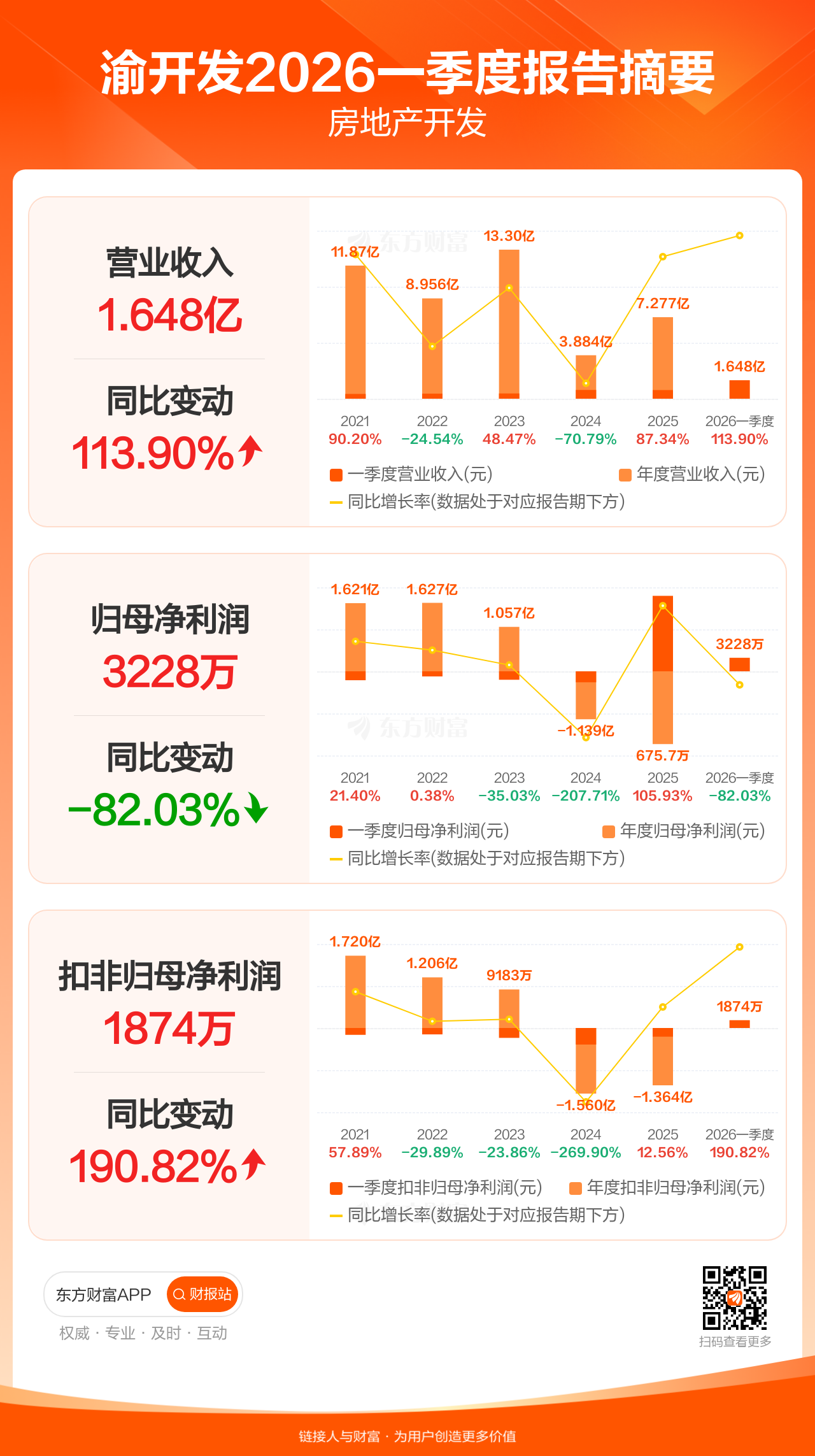 渝开发4月25日发布2026年一季报显示,公司一季度实现营业收入1.65亿元,同比增长113.90%;归母净利润3228.50万元,同比下滑82.03%;扣非归母净利润1873.77万元,同比增长190.82%。
