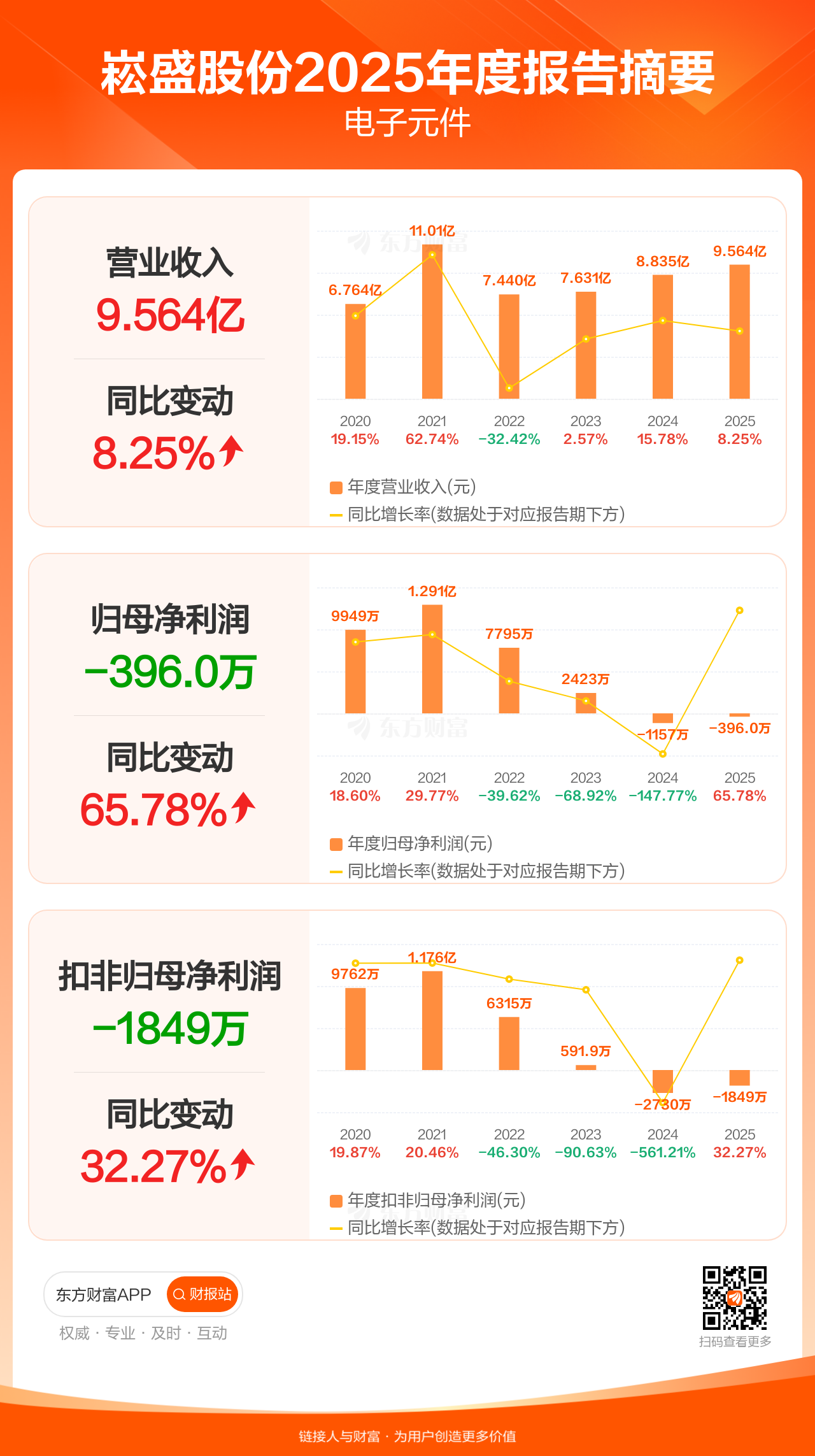 崧盛股份4月25日发布2025年年报显示,公司全年实现营业收入9.56亿元,同比增长8.25%;归母净利润-396.03万元;扣非归母净利润-1848.94万元。