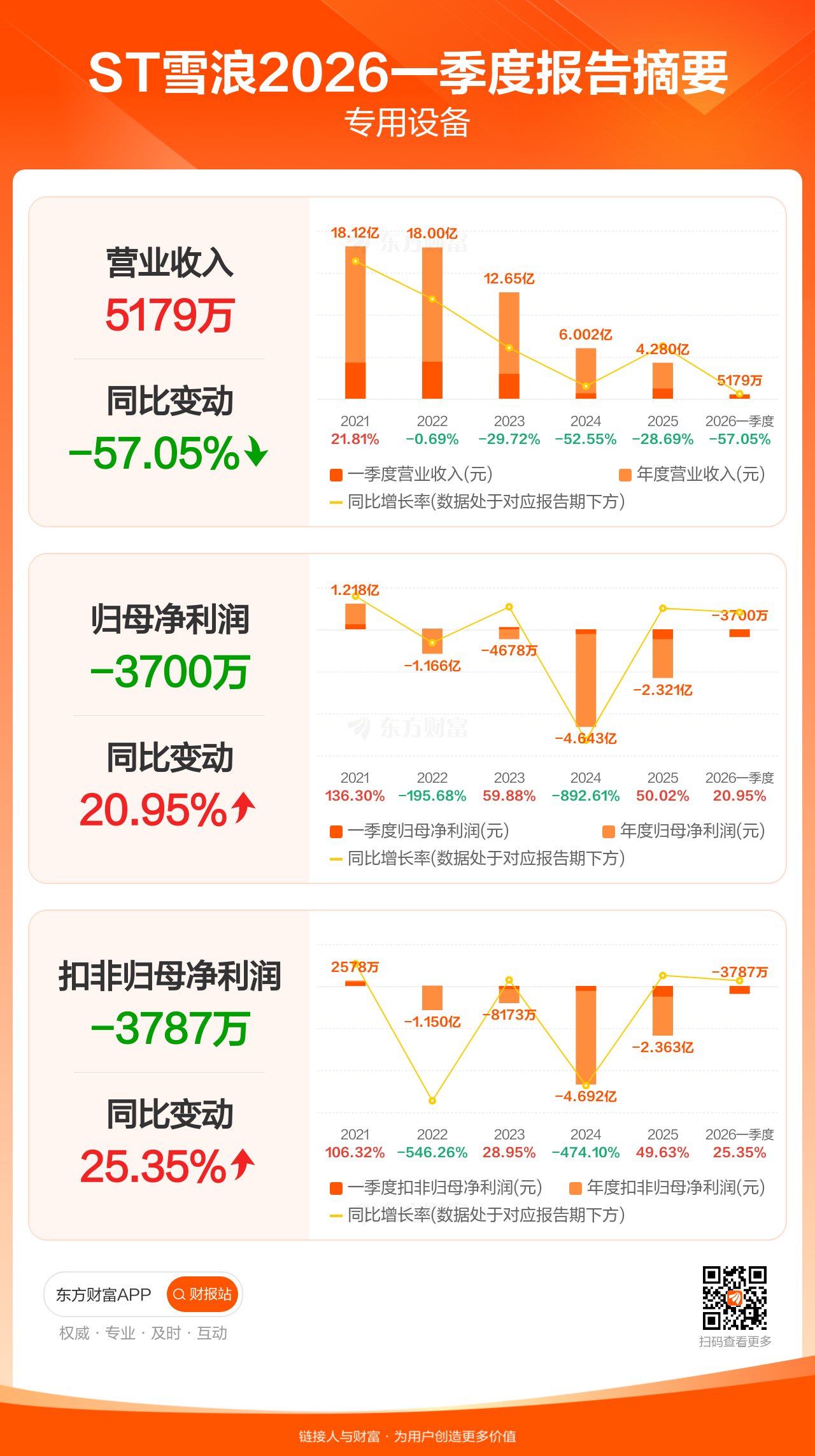 ST雪浪4月25日发布2026年一季报显示,公司一季度实现营业收入5178.90万元,同比下滑57.05%;归母净利润-3699.74万元;扣非归母净利润-3787.49万元。